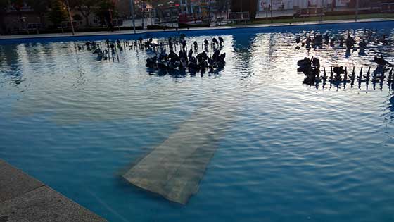 Havuzdan çıkan elektrik düzeneklerinin üstüne kuşlar konar, bir de 2 tarafındaki kaldırımlardan caddeye bakanına, geniş olanına konup konup kalkarlar, sürü sürü böyle, onlarca. Kuşlar (The Birds) gelir aklına, bir Alfred Hitchcock filmi, şimdi bunlar da bana saldırırsa diye düşünürsün, ya üstüme üstüme pike yaparlarsa, öyle bir niyetleri var gibi görünmüyor ama çok da rahatlar, meydan onların sanki, belli mi olur? Bir de, şu filmi bulup bir kere daha seyretsem diye düşünürsün.